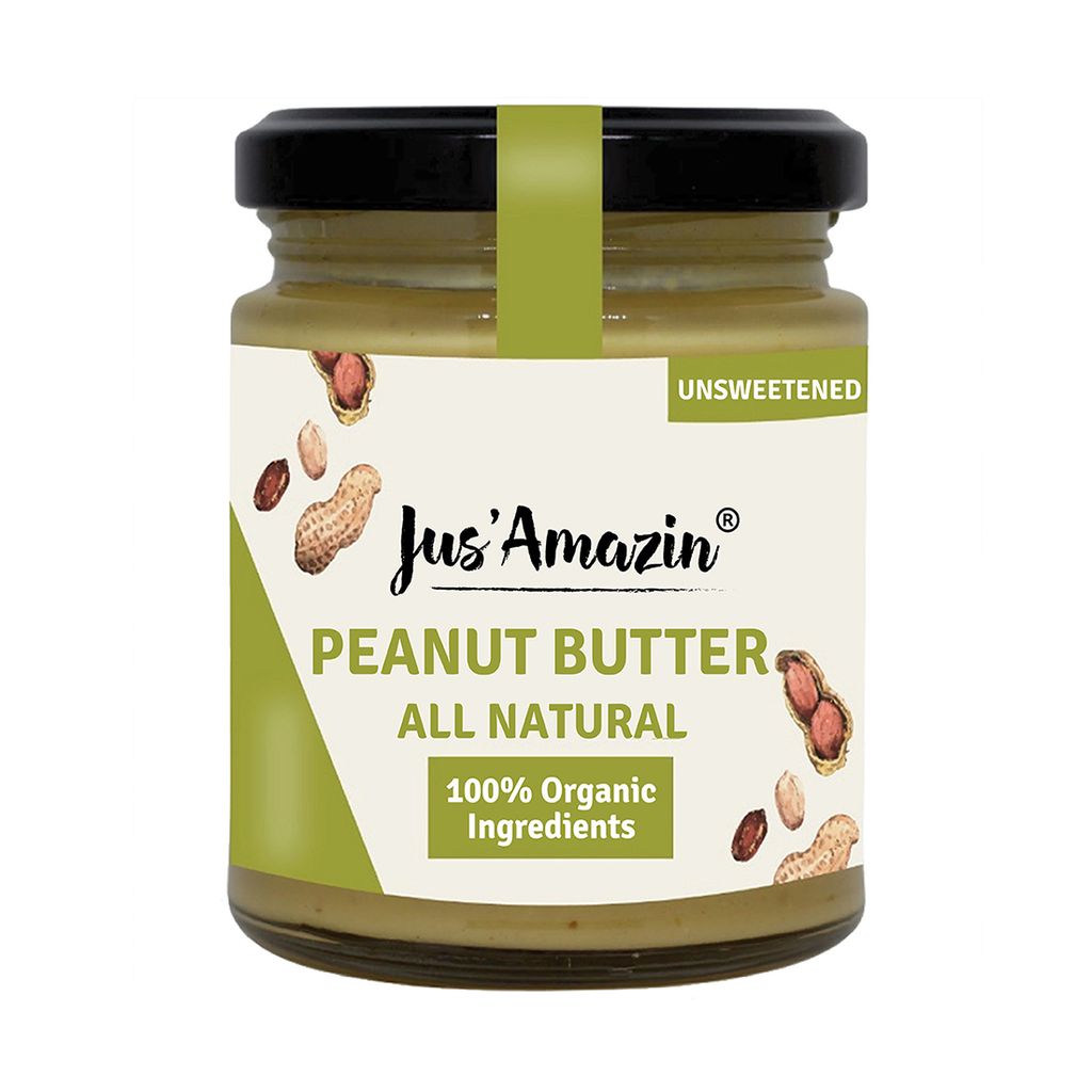 Jus Amazin Peanut Butter - All Natural (Unsweetened) is made with just 1 ingredient - 100% certified Organic Peanuts, and nothing else ! Every spoon of this Peanut Butter has the natural flavour of peanuts, and is packed with macro-nutrients (31% protein, dietary fibers and healthy fats) and naturally occuring micro-nutrients (Vit E, Vit B1, zinc, folate, copper, manganese).