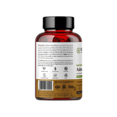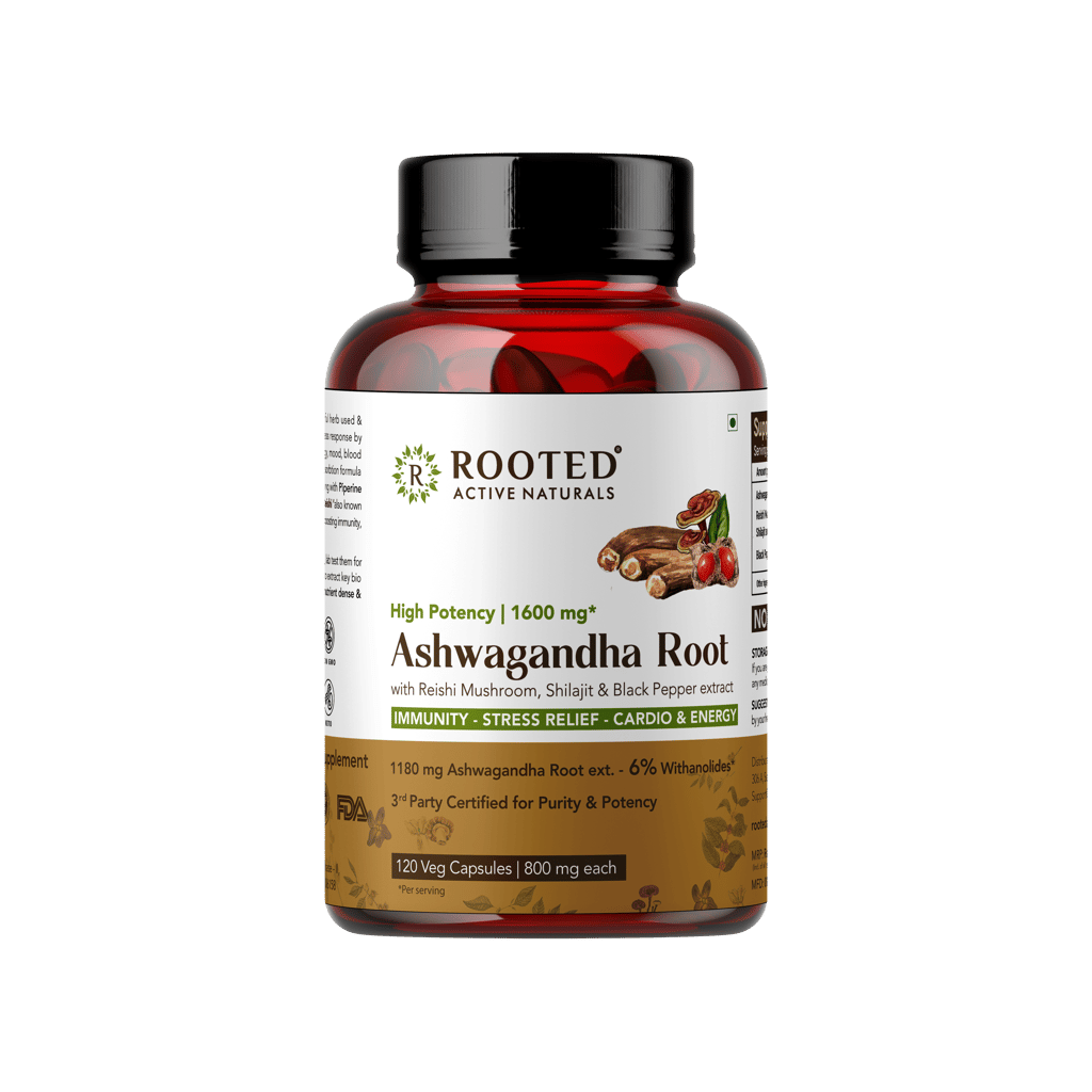 Ashwagandha ( Withania Somnifera ) Is A Powerful Herb Used & Recognized Extensively To Support The Body s Stress Response By Regulating Cortisol Levels ( The Stress Hormone), Energy, Mood, Blood Sugar Levels, Immunity & Overall Wellness. Our High Absorption Formula Is Fortified With Shilajit & Reishi Mushroom For Vitality & Cardio Benefits Along With Piperine ( Black Pepper Extract) For Super Effective Absorption. Each Serving Contains 2 Veg Capsules (1600mg*) - Ashwagandha Root Extract Standardized ( Std ). To 6% Withanolides, Shilajit Extract Std. To 2.5% Fulvic Acid And Black Pepper Extract Std. To 95% Piperine