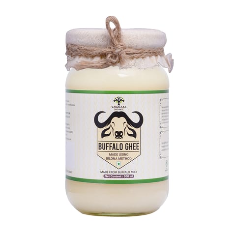 Vanalaya Buffalo Ghee is prepared from Buffalo Butter churned from the milk sourced from our farm which is then carefully packed using the traditional Bilona method using clay pot and packed in glass bottle. The buffalo ghee is rich in fat and low in cholesterol. The buffalo ghee has a unique aroma and taste because of its high-quality butter used in the making of ghee