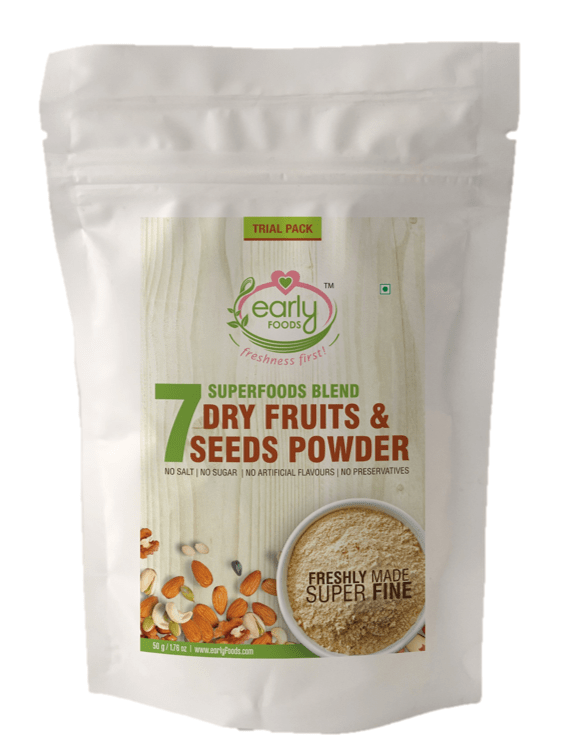Recommended for little ones ready for all grains & nuts, especially for those kids who are super active throughout the day. This super nutritious mix is made from 7 different dry fruits & seeds to form a fine powder. These ingredients are known to help in weight gain, add minerals & vitamins, protein to your growing child naturally. Add them in porridges, milk, fruit smoothies, make parathas and even add them in your curries to naturally nutrify the dishes you make Nutrition Information: - Freshly made dry fruits & seeds mix. We make them in small batches so you can feed your little one super fresh always . We focus on freshness since children need to consume fresh foods for maximum nutrient absorption. - No Salt, Sugar, Milk Powder, Artificial Minerals/Supplements. A 100% Junk free product. - Almonds are considered one of the best brain foods - Watermelon seeds are rich in micronutrients like selenium, magnesium, copper & zinc - Most nuts & seeds are rich in mono-saturated fats, protein & vitamins Ingredients: Watermelon Seeds 36%, Almonds 18%, Cashews 18%, Sunflower Seeds, Pistachio 5%, Walnut 3%, Pumpkin Seeds. And nothing else. No Preservatives, Stabilizers, Artificial Flavours, Artificial Colours. A 100% Chemical free product Shelf Life: 2 Months from MFD Storage & Usage Instructions: After opening the pack, immediately transfer into a clean, dry, airtight container. Keep it in a cool dry place or in a refrigerator. Since there are no preservatives, please use it within 2 months of opening the pack Why Moms love Early Foods: - Made from ancient Indian Super Foods - We make really small batches of food each day. So you can always feed super fresh meals. - Grandma inspired recipes, simple, healthy with minimal processing - No Sugar or salt. - No Preservatives, colours or artificial flavours. All Natural