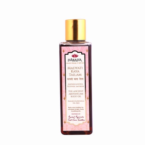 Madyati Kaya Tailam is an Ayurvedic herbs-infused body oil for performing Abhyanga self-massage with the exotic blend of rare herbs & skin-nourishing oils. A daily act of Abhyanga self-massage with Madyati Kaya Tailam deeply nourishes body tissues, detoxifies muscles, soothes nervous system, activates lymphatic flow, strengthens bones, improves vitality, lends a youthful charm to the skin, helps create self-connect & imparts an overall sense of well-being.