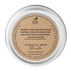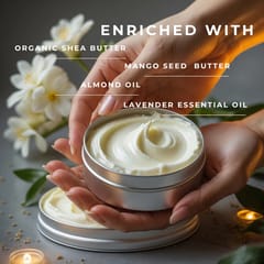 Our body butter features beeswax, an enchanting natural barrier that locks in moisture, guarding your skin against the harsh elements. Embrace the confidence of a non-greasy finish, thanks to the infusion of arrowroot powder that absorbs excess oil, leaving you with a silky, soft touch. As you apply this anti-aging powerhouse, delight in the rejuvenating effects of vitamin E and almond oil, enhancing elasticity and reducing the appearance of scars and fine lines. Rich in antioxidants, our formulation stands as a stalwart defender against environmental damage with the protective properties of jojoba and vitamin E oil. As the final touch, let the relaxing aroma of lavender essential oil envelop your senses, inviting moments of pure relaxation and stress relief.