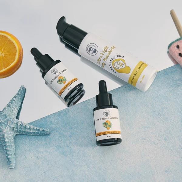 15% Vitamin C serum: Lightweight serum that boosts collagen production in the skin and gives you a clear radiant skin. Prevents signs of aging and improves hydration.